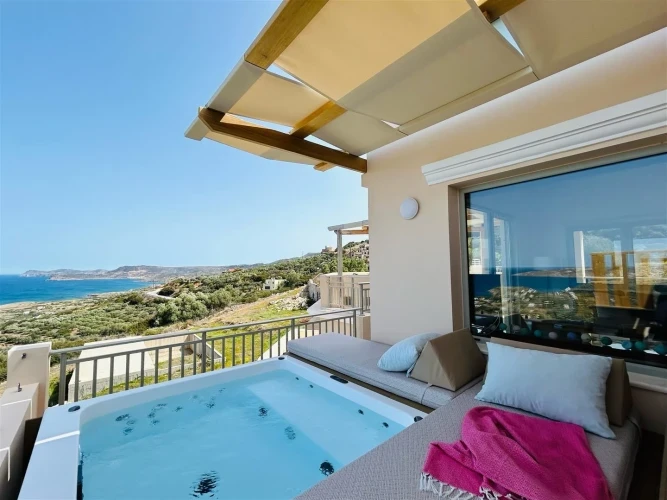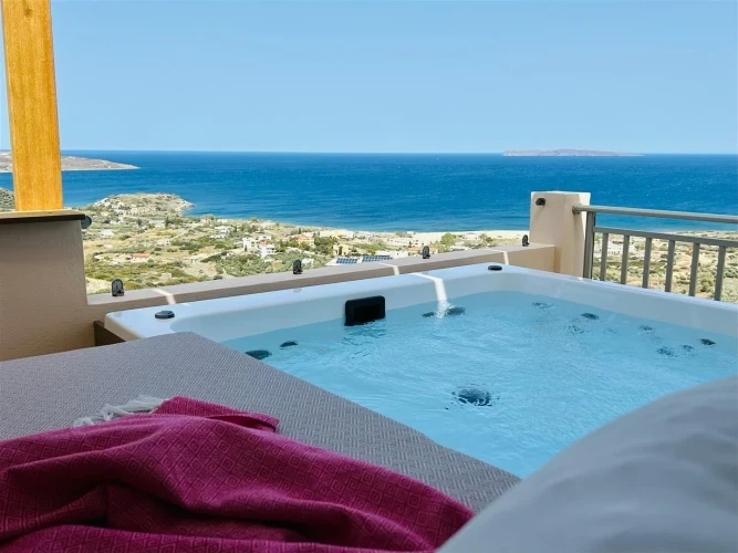 Relax and enjoy your stay at Bella Mare Sitia in this charming maisonette with a private jacuzzi and stunning sea views. The apartment features a living room, bedroom, fully equipped kitchen, and bathroom with bath and shower. Enjoy your meals indoors or on the terrace, relax with modern amenities such as air-conditioning and TV, and experience a peaceful stay in Sitia, Crete, ideal for couples or small families.